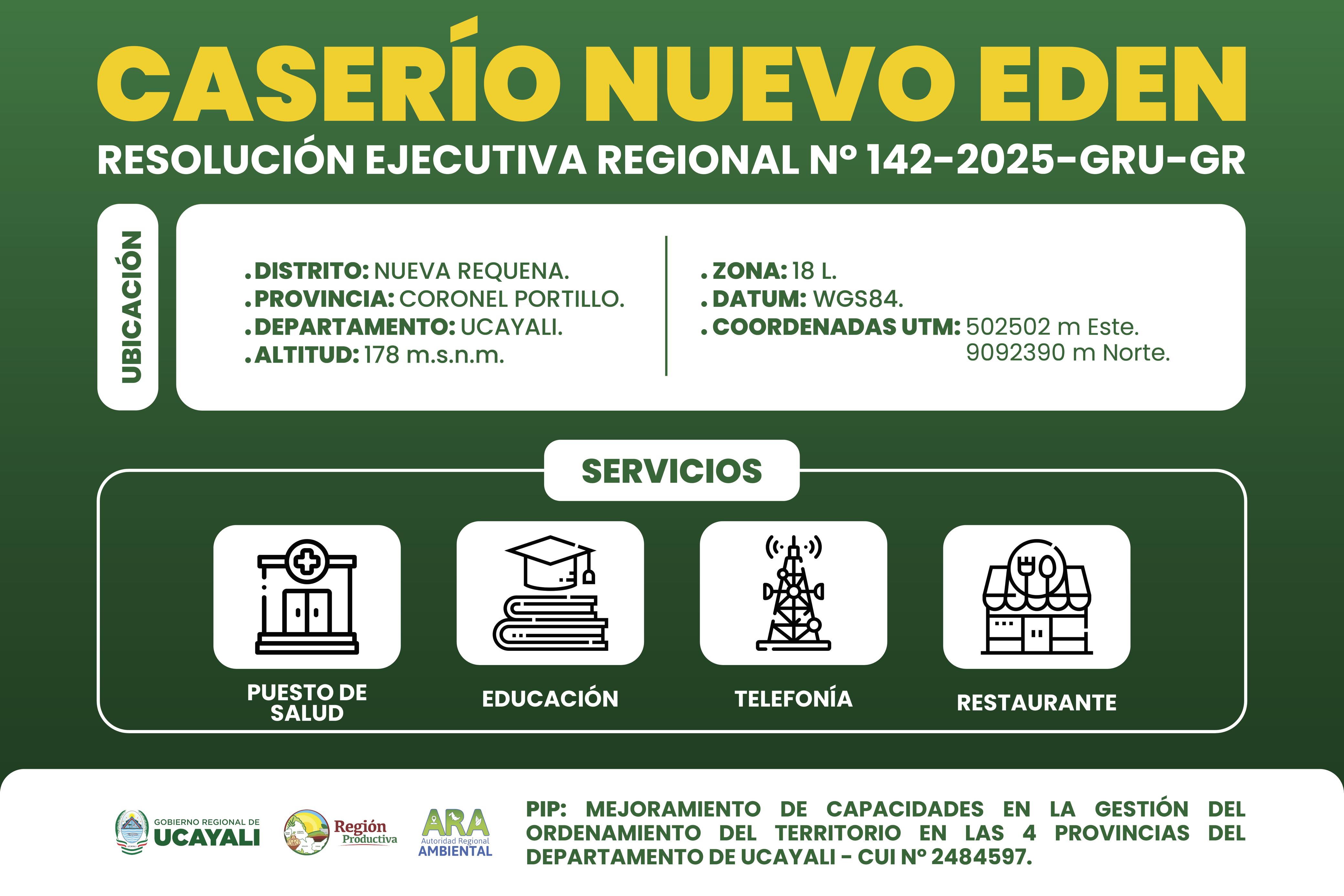 En el marco de la ejecución del Proyecto de Ordenamiento del Territorio, la Dirección de Gestión del Territorio (DGT) de la Autoridad Regional Ambiental (ARAU) hizo la entrega oficial de la Resolución Ejecutiva Regional N°142 – 2025 – GRU – GR a las autoridades (agente municipal y junta directiva) del centro poblado Nuevo Edén del distrito de Nueva Requena. Los pobladores de Nuevo Edén tienen ahora mayores oportunidades de impulsar proyectos para el desarrollo de su localidad, al haber cumplido satisfactoriamente con los requisitos para que su localidad sea considerada oficialmente caserío.